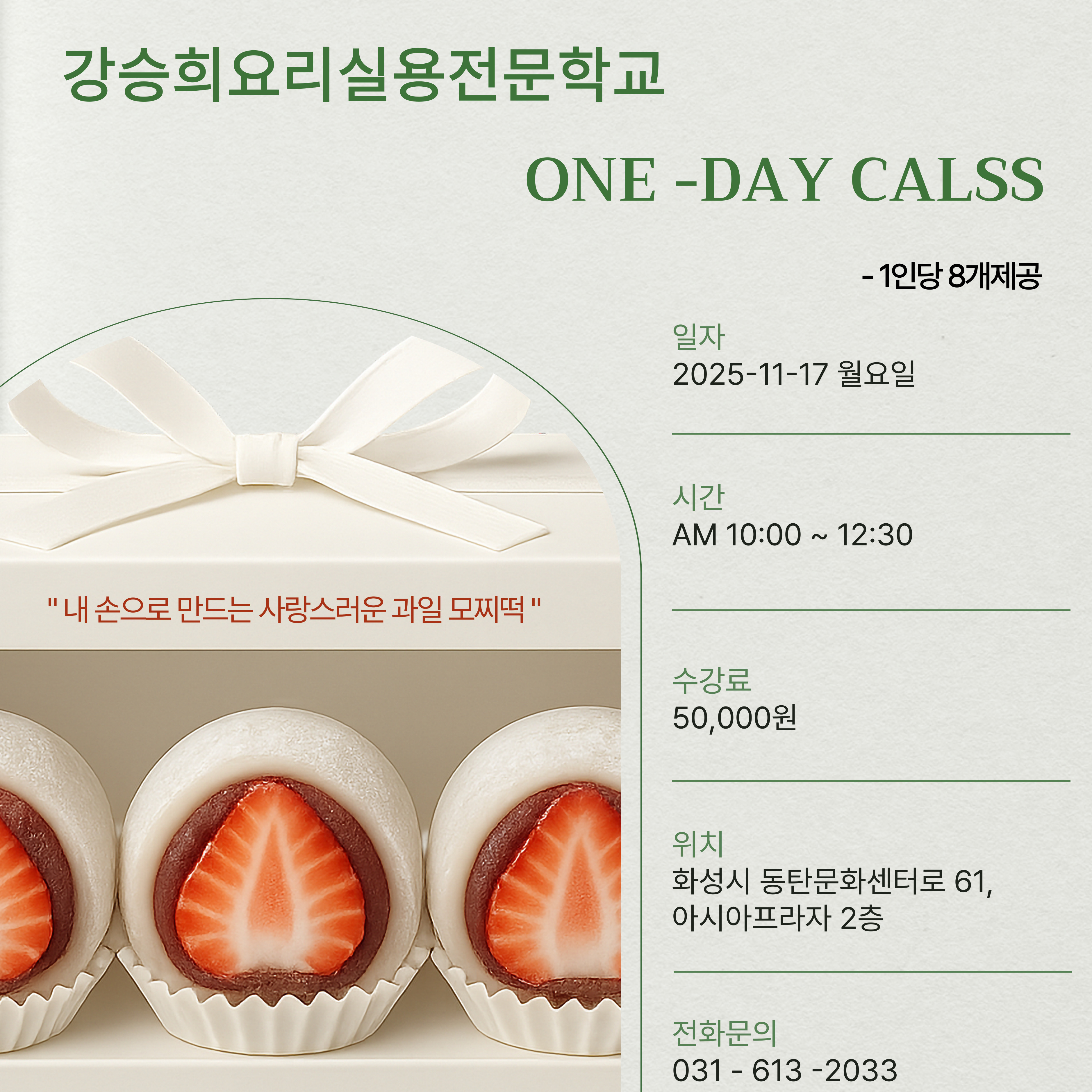 - 장소 : 경기도 화성시 동탄문화센터로 61, 아시아프라자 2층 강승희요리실용전문학교