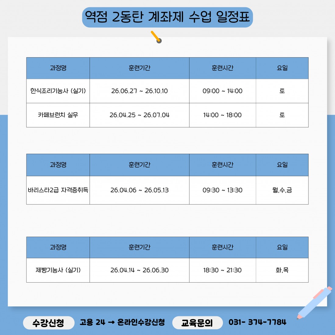 [역점 국비과정 일정표]국비과정 일정표입니다!내일배움카드 / 일반등록가능자세한 일정 및 수강 문의는 본원으로 연락주세요 또한, 일정표에 없는 과목도 차기과정으로 계속 업데이트 될 예정입니다 연락주시면 차기과정 안내와 과정 개설에 적극 반영하겠습니다역점 문의전화 : 031-374-7784경기도 화성시 동탄오산로 86-11, 광장프리미엄빌 1차 3층
