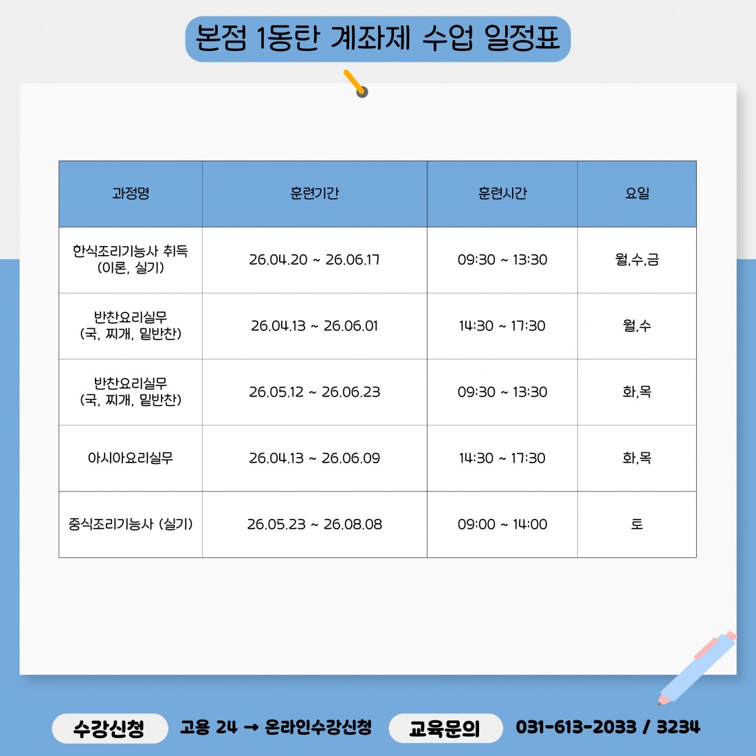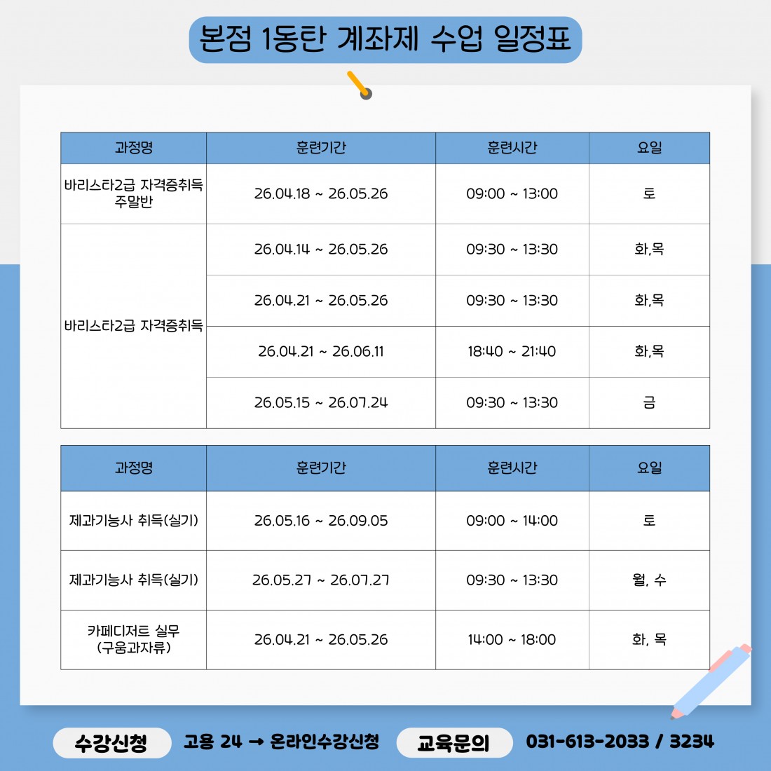[본점 국비과정 일정표]국비과정 일정표입니다!내일배움카드 / 일반등록 가능자세한 일정 및 수강 문의는 본원으로 연락주세요또한, 일정표에 없는 과목도 차기과정으로 계속 업데이트 될 예정입니다 연락주시면 차기과정 안내와 과정 개설에 적극 반영하겠습니다 본점 문의전화 : 031-613-2033경기도 화성시 동탄문화센터로61, 아시아프라자 2층.6층