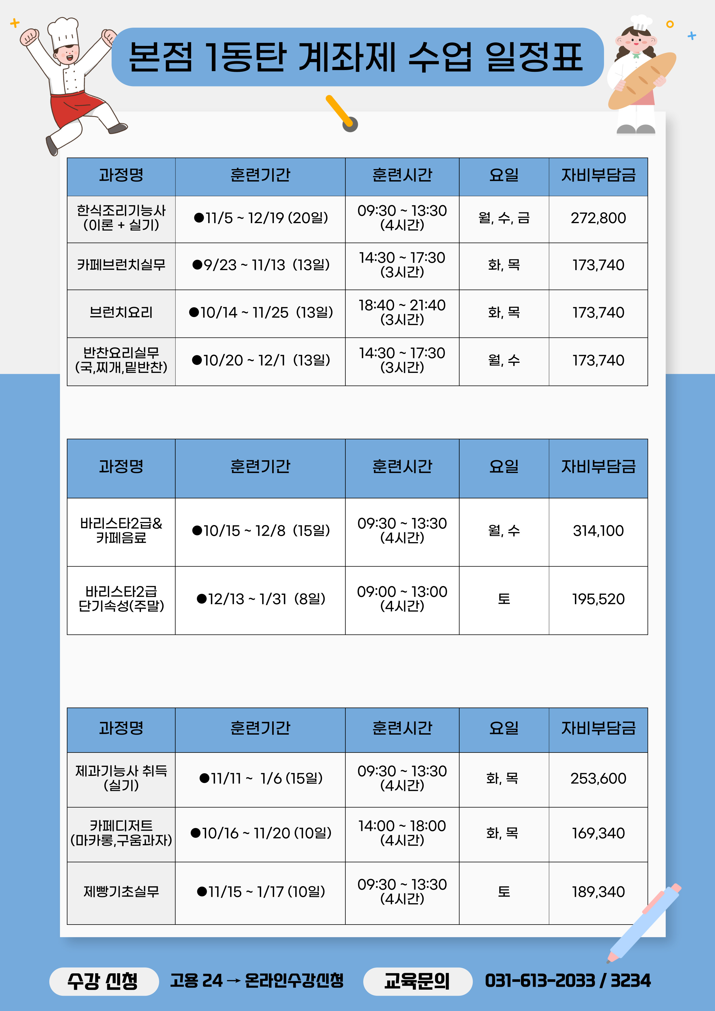 본점 국비과정 일정표입니다. 자세한 일정 및 수강 문의는 본원으로 연락주세요 !또한, 일정표에 없는 과목도 차기과정으로 계속 업데이트 될 예정입니다.연락주시면 차기과정 안내와 과정 개설에 적극 반영하겠습니다 !- 본점: 031-613-2033 / 3234- 경기도 화성시 동탄문화센터로61, 아시아프라자 2층.6층
