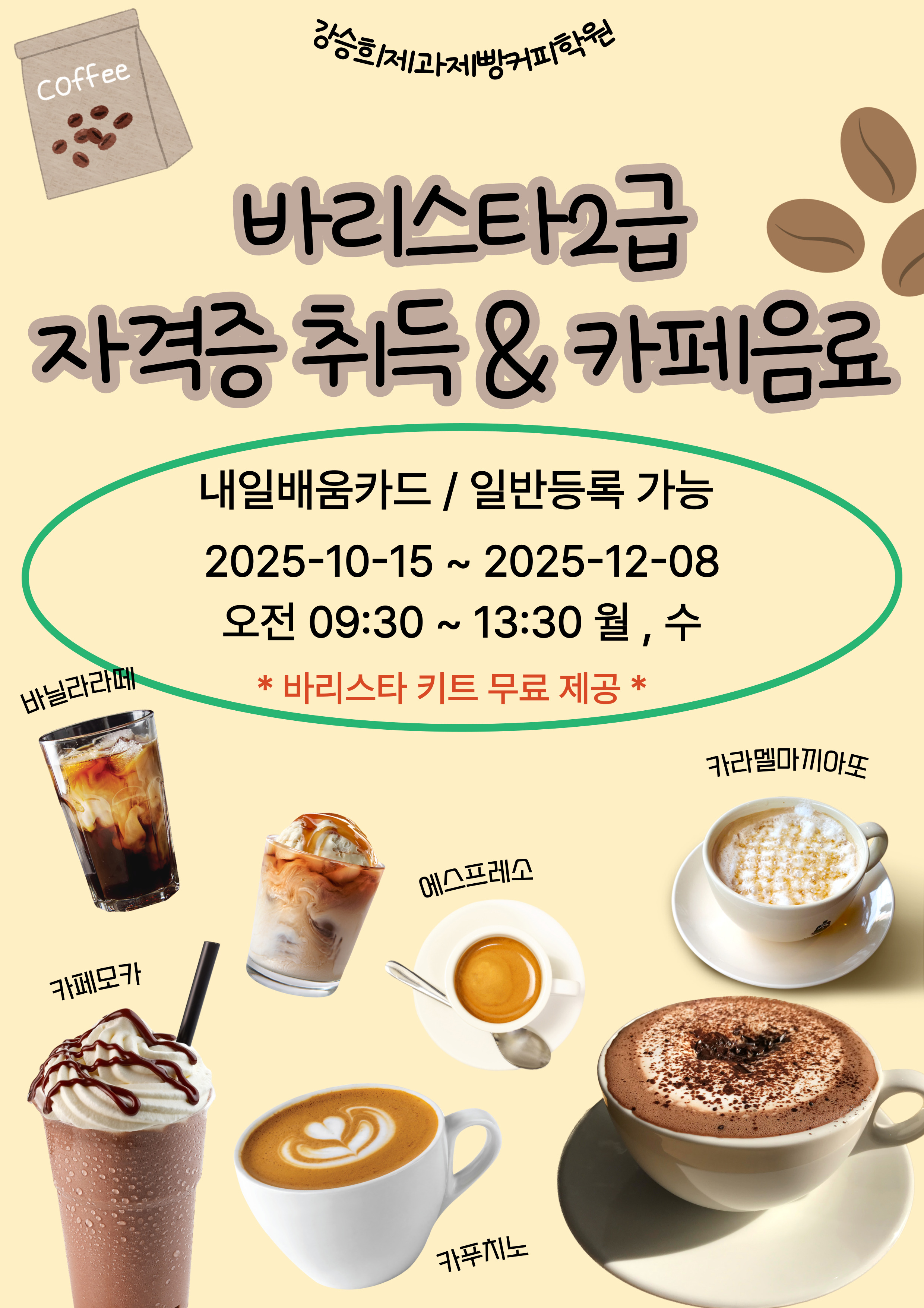 강승희제과제빵커피학원에서 바리스타 2급 자격 대비 + 카페 음료 실습 수업이 개강합니다!