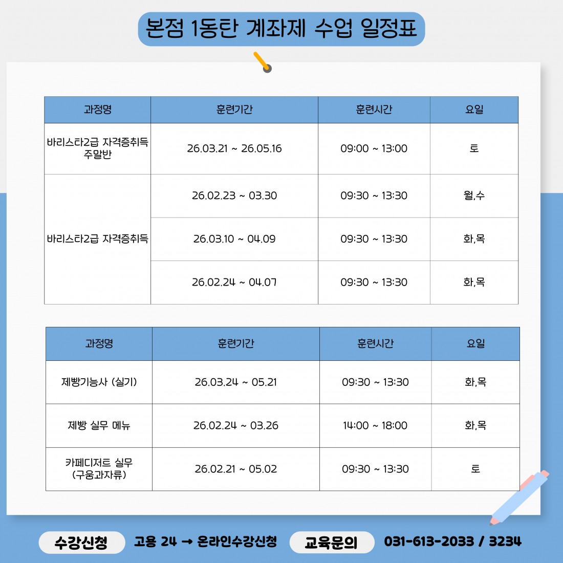 [점 국비과정 일정표]국비과정 일정표입니다!내일배움카드 / 일반등록 가능자세한 일정 및 수강 문의는 본원으로 연락주세요.또한, 일정표에 없는 과목도 차기과정으로 계속 업데이트 될 예정입니다 ! 연락주시면 차기과정 안내와 과정 개설에 적극 반영하겠습니다 ! 본점 문의전화 : 031-613-2033위치 : 경기도 화성시 동탄문화센터로61, 아시아프라자 2층.6층