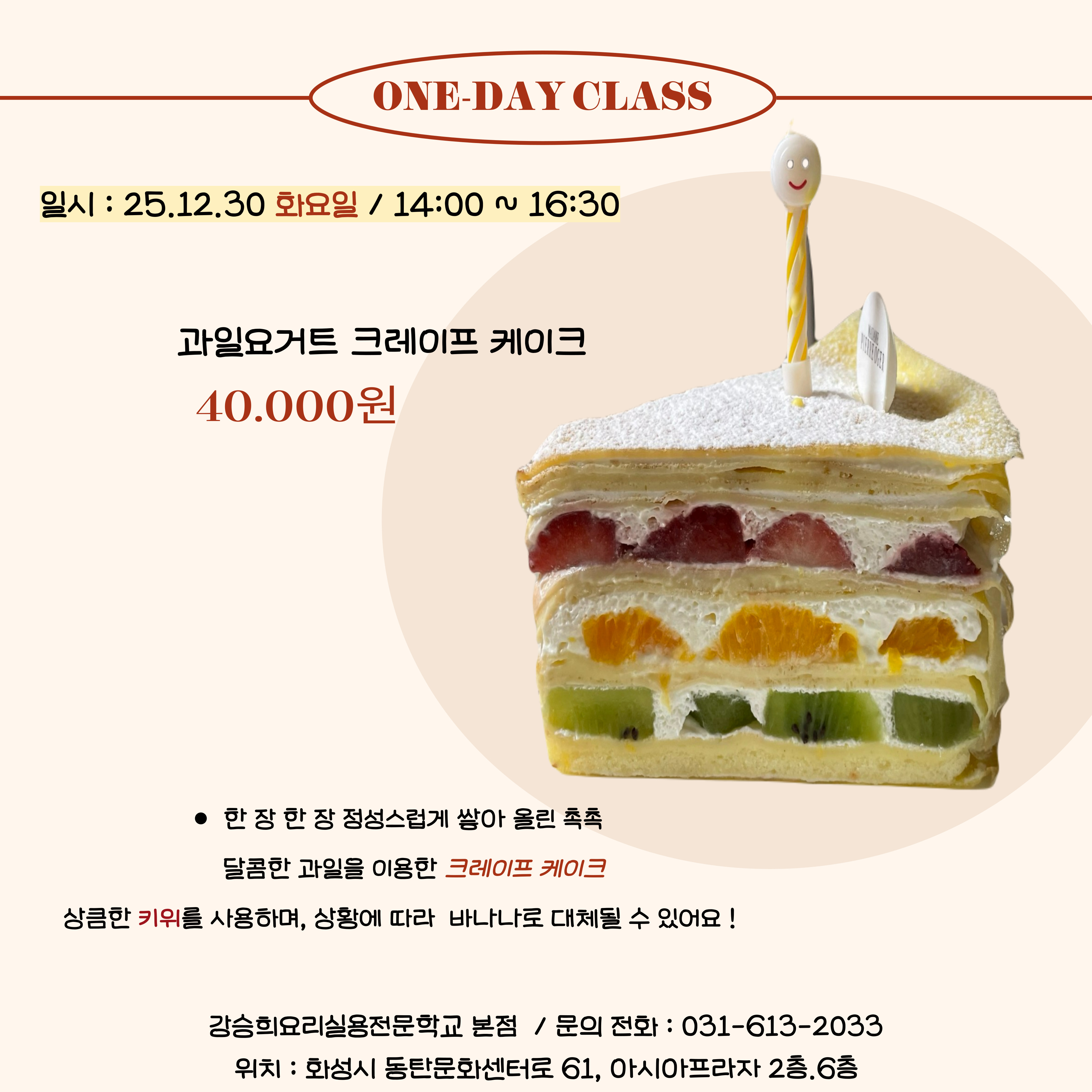 한 장 한 장 정성스럽게 구워낸 크레이프에 달콤한 요거트 크림과 신선한 과일을 겹겹이 쌓아 촉촉하고 산뜻한 케이크를 완성해보는 시간  !